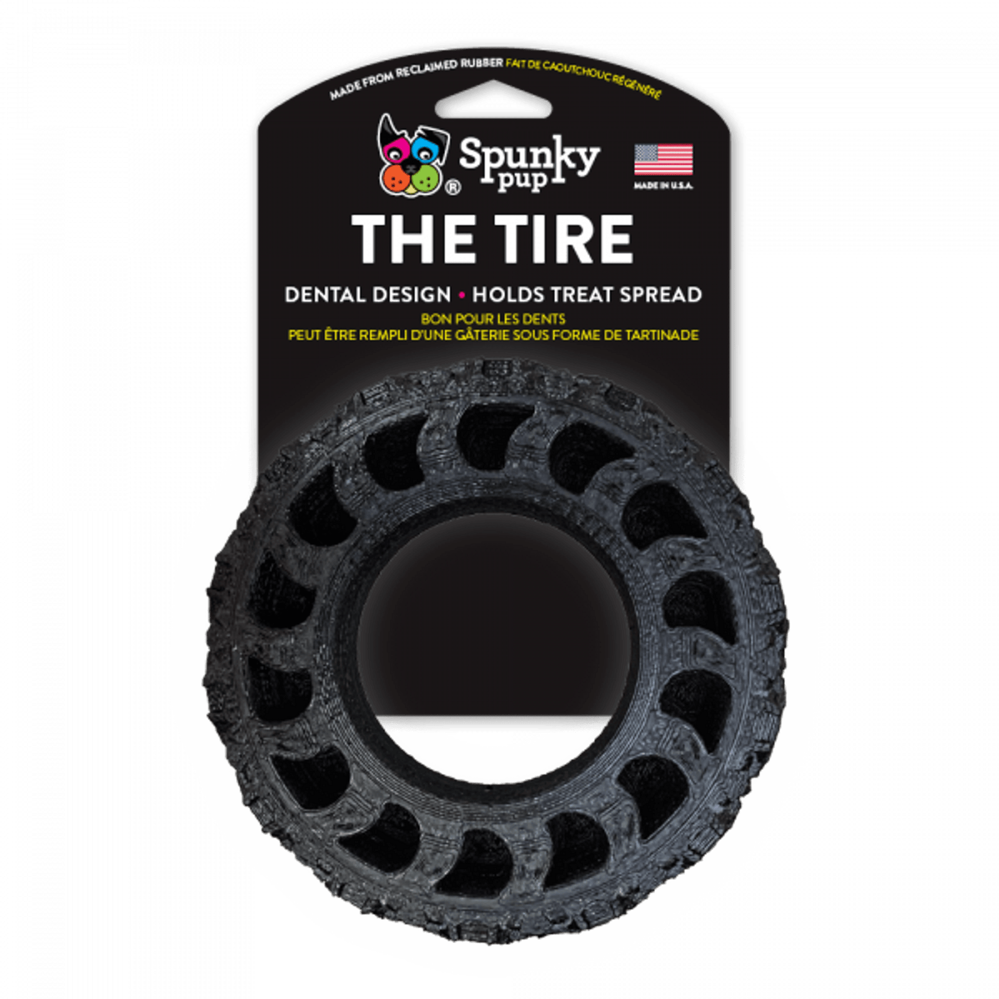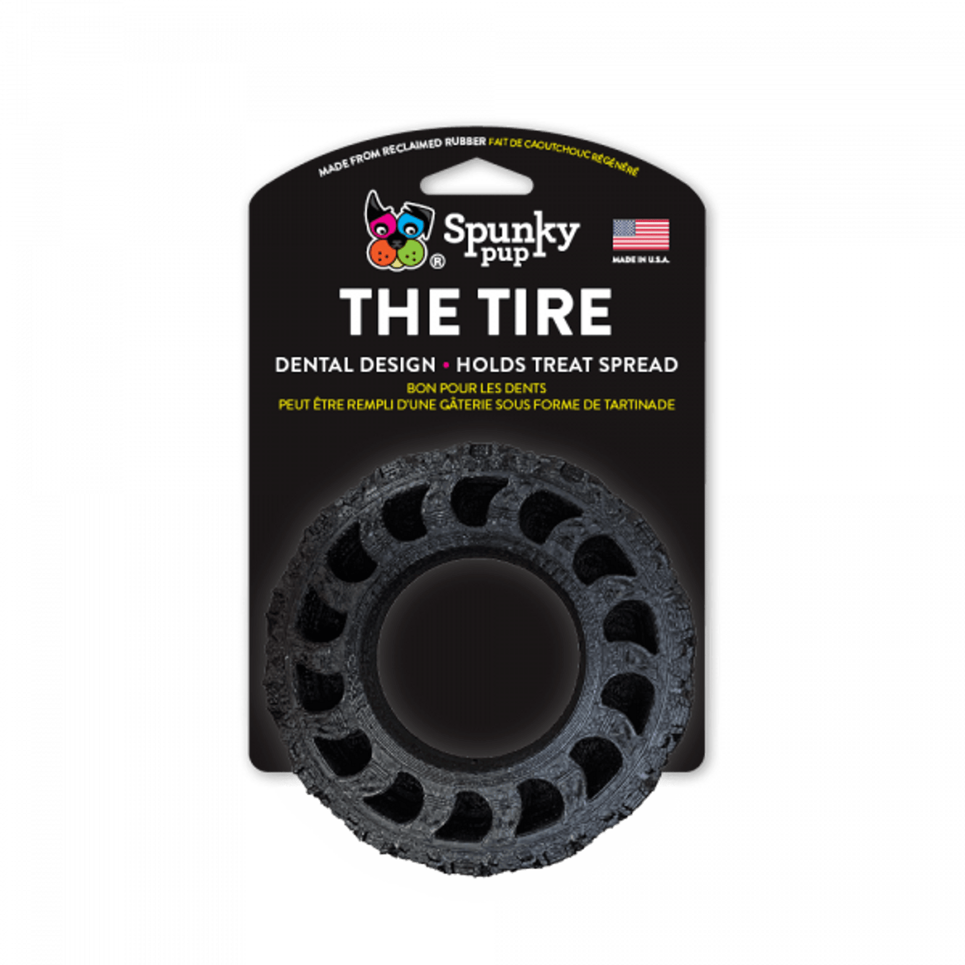 Proudly made in the USA, The Tire not only offers durability but also features a unique dental design and texture. This thoughtfully engineered surface is perfect for holding peanut butter or your dog's favorite